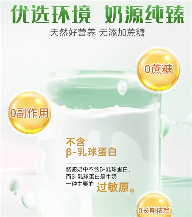 驼宝儿童成长益生菌驼乳粉,以“天然驼乳+活性益生菌+多维营养矩阵”的科学配方,为孩子打造从肠道到全身的成长赋能方案。对于经常腹泻的孩子,益生菌可修复肠道黏膜屏障;对于便秘的孩子,益生菌能促进肠道蠕动、软化粪便。它的蛋白质结构更接近母乳,含有人体必需的8种氨基酸;钙含量是牛奶的多倍,且以乳钙形式存在,易被孩子骨骼吸收,助力孩子突破身高瓶颈;维生素A、D、B族的含量也远超普通乳制品,能促进孩子视力发育、调节钙磷代谢、提升神经系统功能。更重要的是,驼乳中富含的乳铁蛋白、免疫球蛋白,是孩子免疫力的“天然盾牌”,能直接增强孩子对病原体的抵抗力,让孩子少生病,成长不中断。