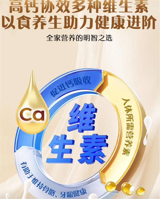 实现了“钙+维生素”的协同作用,能通过维生素D提升钙的吸收与重吸收效率、维生素K能促进钙向骨钙转化,从而强化骨骼健康,预防骨质疏松和骨折,一瓶多效,为中老年健康提供全方位支持。且驼乳性质温和,不易引起肠胃刺激,适合中老年人长期饮用,每日1-2杯,即可轻松补充营养。