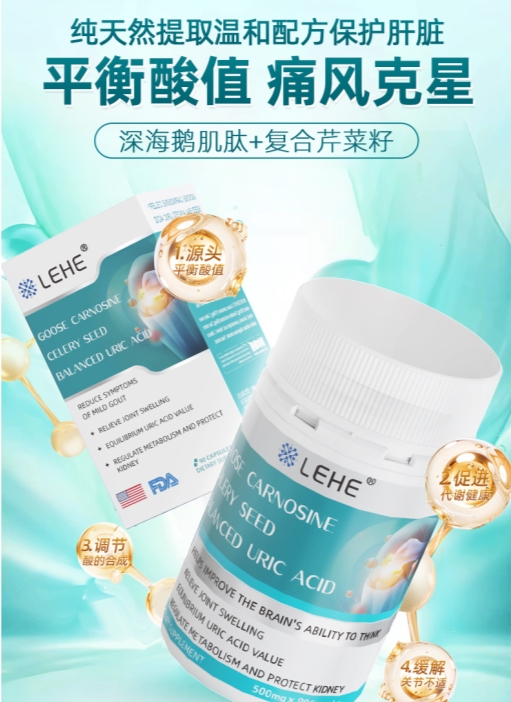 正是在这样的健康困境之下,LEHE乐和制药鹅肌肽芹菜籽平衡尿酸胶囊,凭借其 “深海鹅肌肽 + 复合芹菜籽” 的科学配方,为现代人提供了一种更为理性的解决之道。它无需人们彻底舍弃生活的乐趣,而是借助天然成分的力量,为身体构筑起一道坚固的代谢防线。