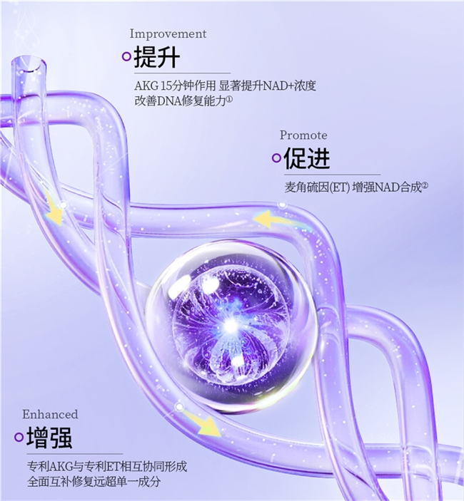 该配方以麦角硫因与AKG为核心,形成协同机制。AKG作为三羧酸循环的关键中间代谢物,直接参与并提升细胞能量ATP的合成效率,同时研究显示其具有调节蛋白质稳态与支持细胞表观遗传健康的潜能。结合麦角硫因的线粒体保护作用,本配方旨在从“供能”与“护能”双重维度优化细胞代谢功能。同时复配PQQ与亚精胺,协同增强线粒体健康与细胞自我更新能力。