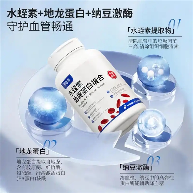 ②科学配方与全周期防护:围绕“精准靶向+全面养护”的核心设计逻辑,这款产品以高纯度水蛭素为核心战力,精准锁定血栓靶点并高效溶解,从根源扫清血管堵塞隐患;同时搭配地龙蛋白与灵芝提取物,构建“清血栓-通循环-抗炎症”的三阶递进作用体系,全方位优化血管内环境,实现从靶向溶栓到全面护脉的一站式健康守护。