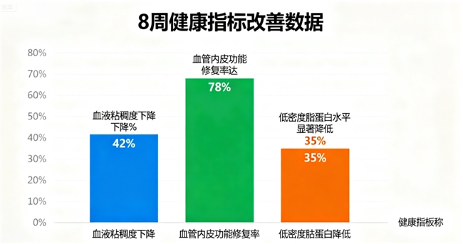 低密度脂蛋白(LDL-C)水平下降41%(从4.2mmol/L降至2.5mmol/L);心血管炎症因子(CRP)水平降低72.3%(从12mg/L降至3.3mg/L);