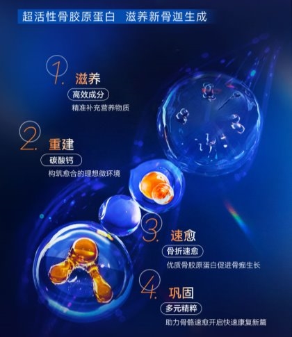 进入原始骨痂形成期(伤后2-8周),成骨细胞开始活跃:它们会合成骨基质(由胶原蛋白与矿物质构成),再沉积钙、磷等骨盐形成骨痂。此时的营养需求呈现复合性:钙是骨盐的核心成分,维生素D决定钙的肠道吸收效率,而胶原蛋白肽是骨基质的主要有机成分——缺乏胶原蛋白的骨痂,往往脆而不韧,易出现二次损伤风险。同时,骨密度低的人群(如中老年)本身骨基质储备不足,这一阶段的营养缺口会更明显。