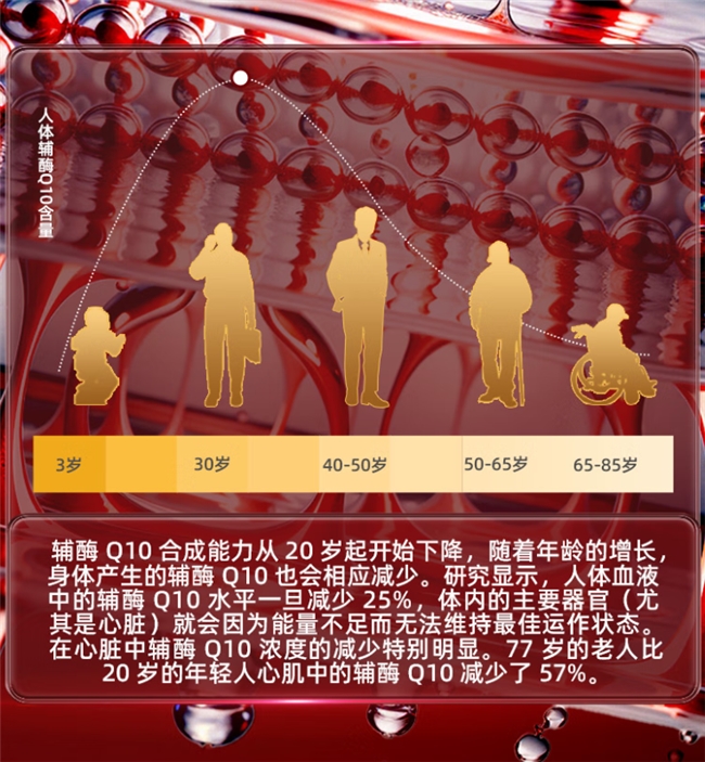 在快节奏的现代生活里,心脏早已成了“超负荷运转的引擎”:职场人凌晨两点的工位灯光、通勤路上塞不完的咖啡、永远赶不完的deadline,中老年人随着年龄增长,血管弹性逐年下降,自身合成辅酶Q10的能力更是断崖式衰退,80岁时的含量仅为青年时期的42.9%;就连看似平常的外卖饮食、长期久坐、城市空气污染,都在悄悄侵蚀血管内皮,让胸闷、心慌、乏力等不适成为越来越多人的“日常困扰”。我们总以为心脏的“警报”离自己很远,却忽略了这些日积月累的“隐形负担”,正在慢慢消耗着心血管的健康活力。