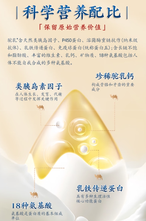 这一配方设计,旨在将驼乳自身的天然营养优势与益生菌的肠道调节功能相结合。驼乳中富含的类胰岛素因子、乳铁传递蛋白等活性成分,与益生菌共同构成了一个复合营养体系。通过这种方式,产品试图在提供基础营养的同时,对维持肠道菌群平衡、促进营养物质吸收等健康环节提供支持。