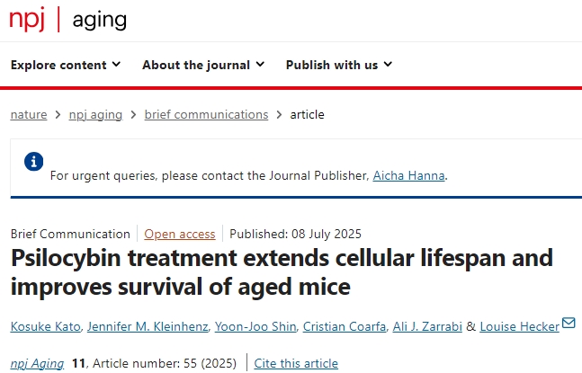 随着衰老干预技术发展,天然活性分子在延缓衰老研究中日益受到关注。近期,《npj Aging》发表研究显示,源自致幻蘑菇的活性成分赛洛辛(Psilocin)在体外细胞与动物模型中表现出显著的延缓衰老潜力,为相关科研提供了新思路。